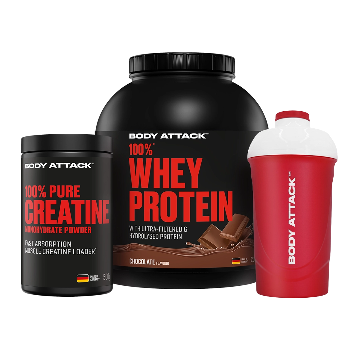In deinen Eiweiß Shake gehört nur bestes Proteinpulver: Das WHEY PROTEIN. Aber warum? Es ist eine von zwei Proteinarten Whey und Casein und wird aus Molke gewonnen. Dieses Eiweiß punktet mir seiner besonders hohen biologische Wertigkeit. Heißt: Es werden mehr Proteine in deinem Körper umgewandelt, die dir beim Aufbau deiner Muskulatur helfen. Von allen Eiweißen wird Whey vom Körper am schnellsten aufgenommen. Und wir setzen sogar noch einen drauf! Neben reinem Whey Konzentrat besticht das 100 % WHEY PROTEIN durch zusätzliches Hydrolysat. Einfach gesagt: „aufgespaltenes Protein“. Dein Benefit? Das Eiweiß wird noch schneller verwertet - also ein echter Volltreffer für dein Ziel Muskelaufbau!