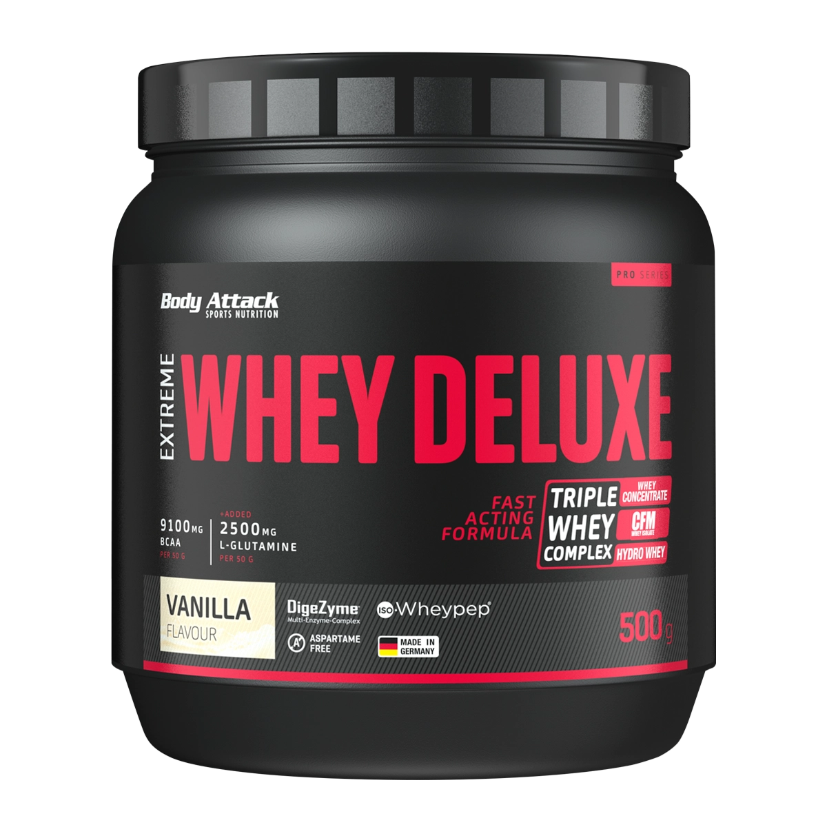 Calciumcaseinat (48,6%), Molkeneiweiß-Konzentrat (32,1%), Milcheiweißkonzentrat (9%), Aroma (enthält Laktose), enzymatisch hydrolysiertes Molkeneiweiß-Isolat (Wheypep®) (1%), Hühnerei-Eiweißpulver (1%), L-Leucin, L-Carnitin (Carnipure™), Speisesalz, L-Valin, L-Isoleucin, Süßungsmittel (Acesulfam K, Natriumcyclamat, Sucralose, Saccharin), Trennmittel (Siliciumdioxid), LAscorbinsäure, Emulgator (Soja-Lecithin), Nicotinamid, DL-alpha Tocopherylacetat, Säuerungsmittel (Milchsäure), Säureregulator (Calciumlactat), Calcium-D-pantothenat, Riboflavin, Pyridoxinhydrochlorid, Thiaminmononitrat, Pteroylmonoglutaminsäure, DBiotin, Cyanocobalamin.